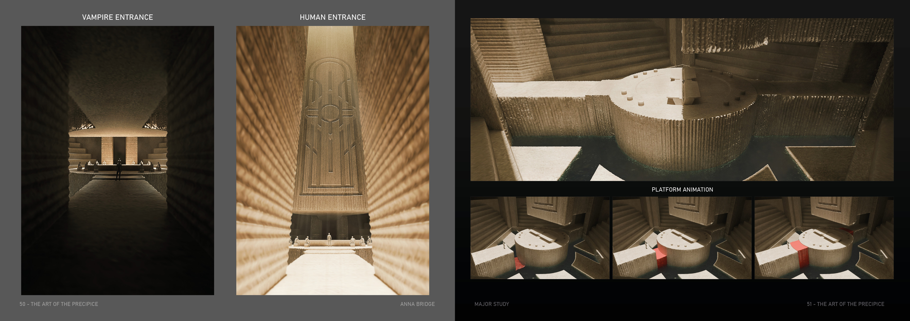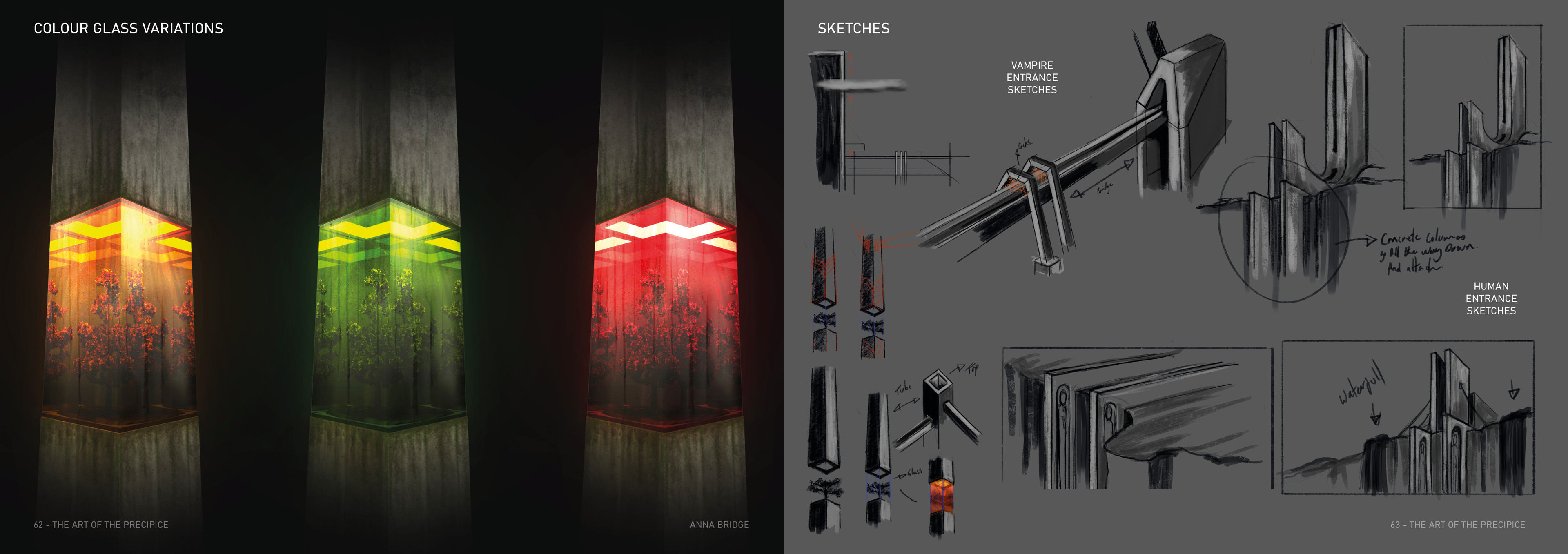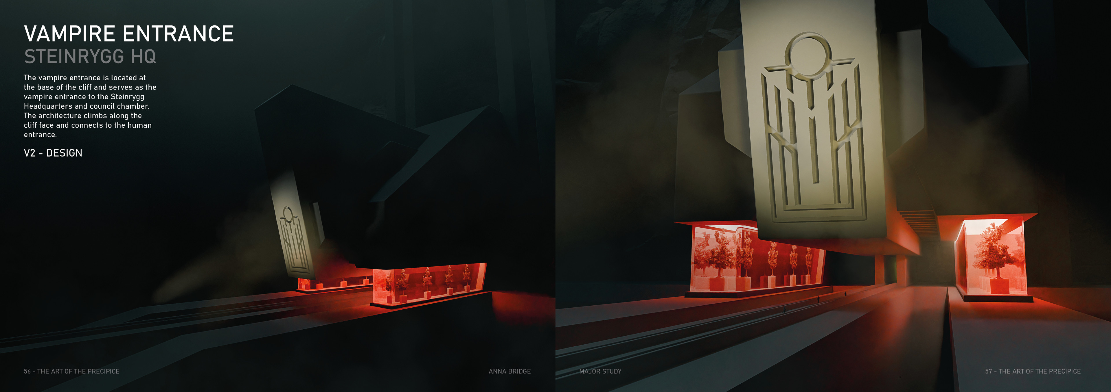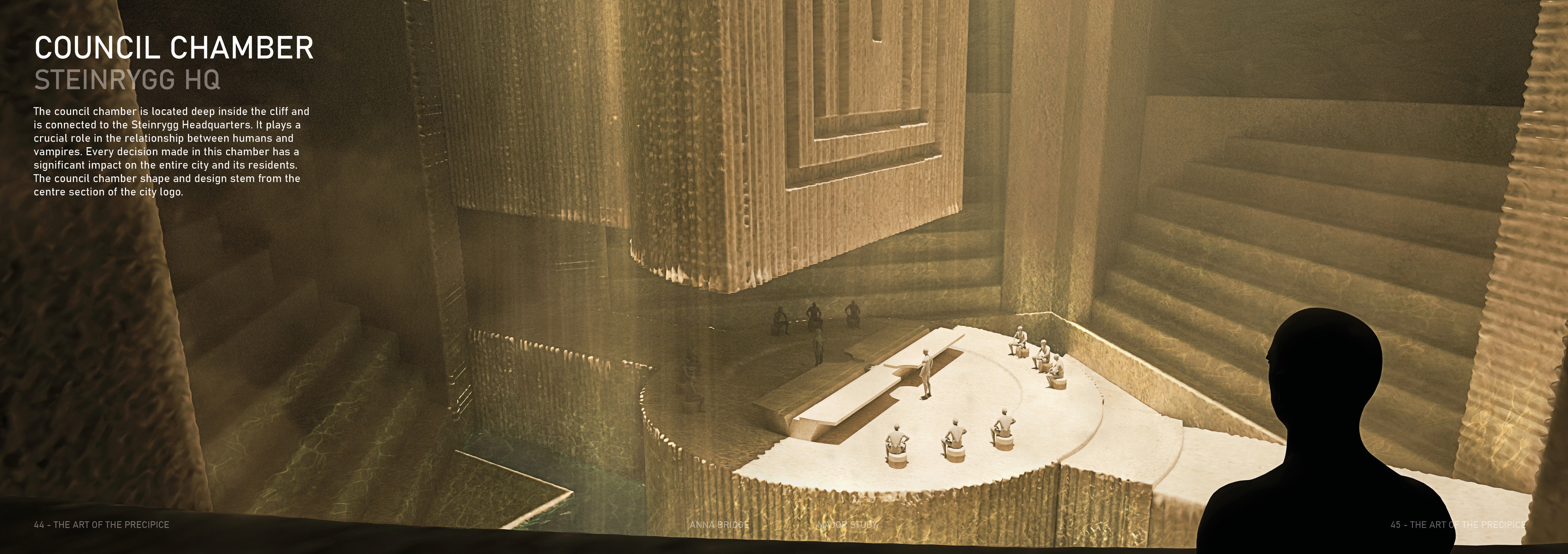 The Precipice is a science fiction TV series set in the Arctic Circle, where the sun never sets, at the edge of a dramatic mountain range. The city of Steinrygg is split into two factions: humans live in the daylight in the upper section of the city, while vampires occupy the valley below, protected from sunlight by a thick mountain fog. Dominating the city is the austere headquarters of the authoritarian government, connecting both the human and vampire realms. The severe concrete building runs from above the cliff’s edge through the centre of the mountain and down to the valley below, providing a central forum where vampires and humans can converge. For centuries, the two factions have coexisted under a strict alliance between the human and vampire governments.
