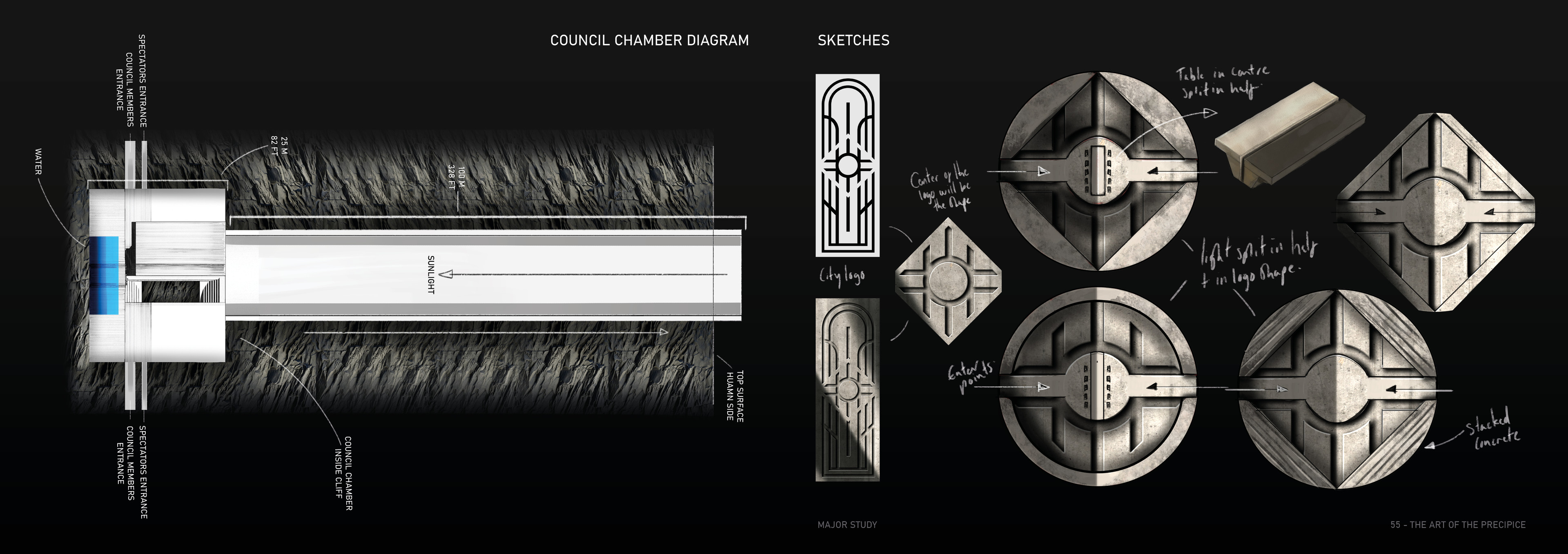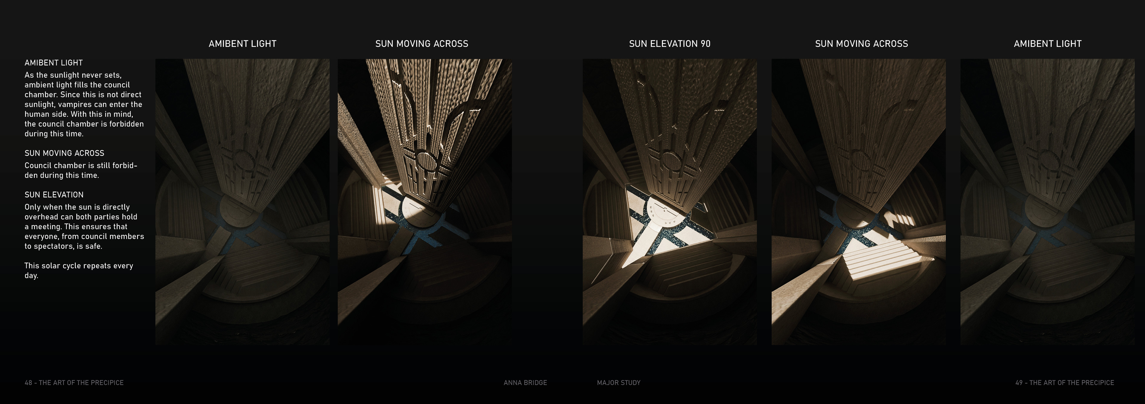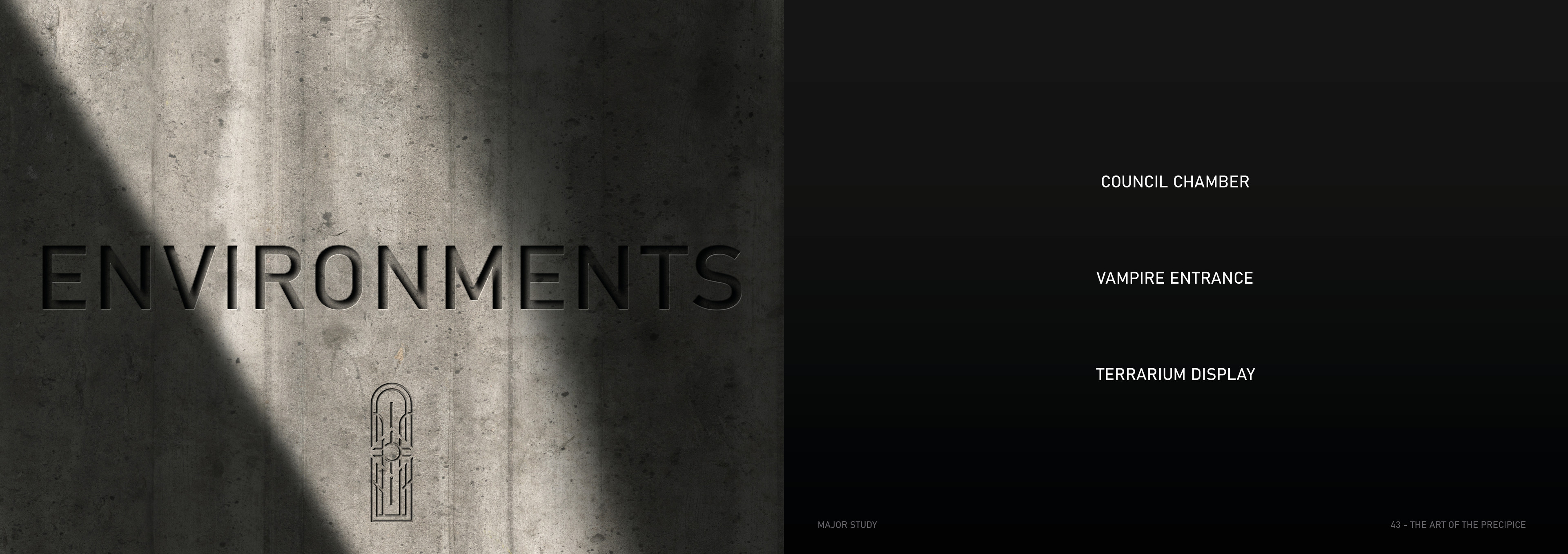 The Precipice is a science fiction TV series set in the Arctic Circle, where the sun never sets, at the edge of a dramatic mountain range. The city of Steinrygg is split into two factions: humans live in the daylight in the upper section of the city, while vampires occupy the valley below, protected from sunlight by a thick mountain fog. Dominating the city is the austere headquarters of the authoritarian government, connecting both the human and vampire realms. The severe concrete building runs from above the cliff’s edge through the centre of the mountain and down to the valley below, providing a central forum where vampires and humans can converge. For centuries, the two factions have coexisted under a strict alliance between the human and vampire governments.