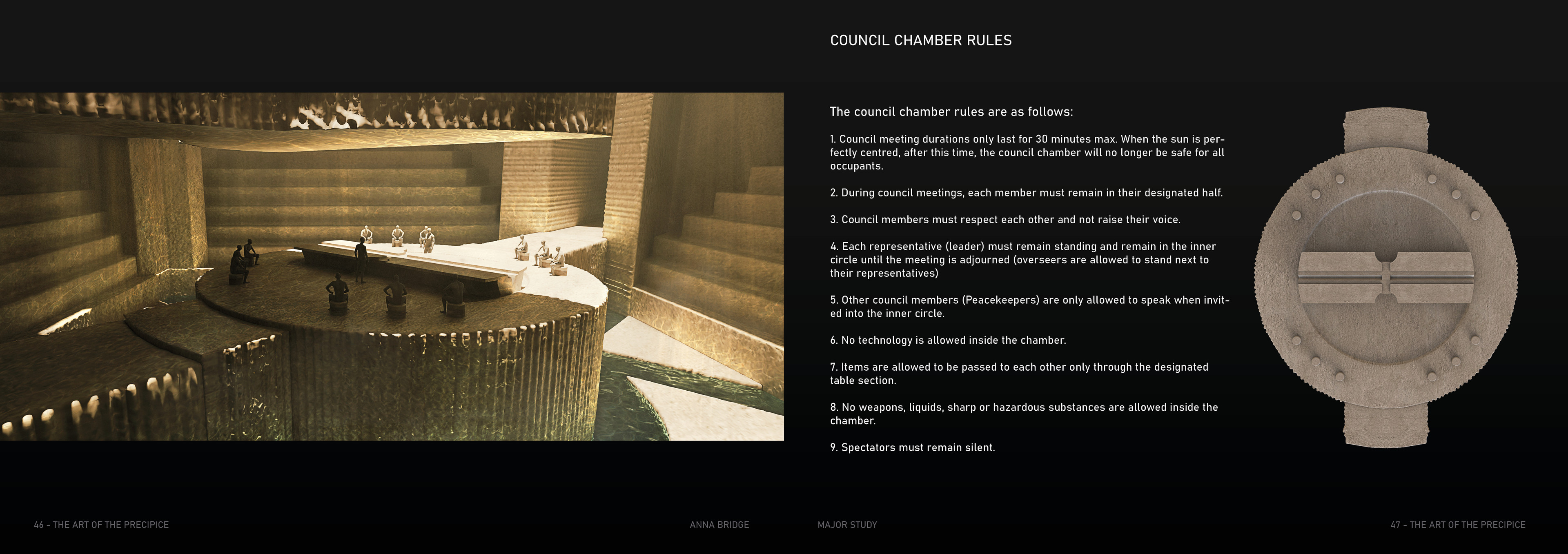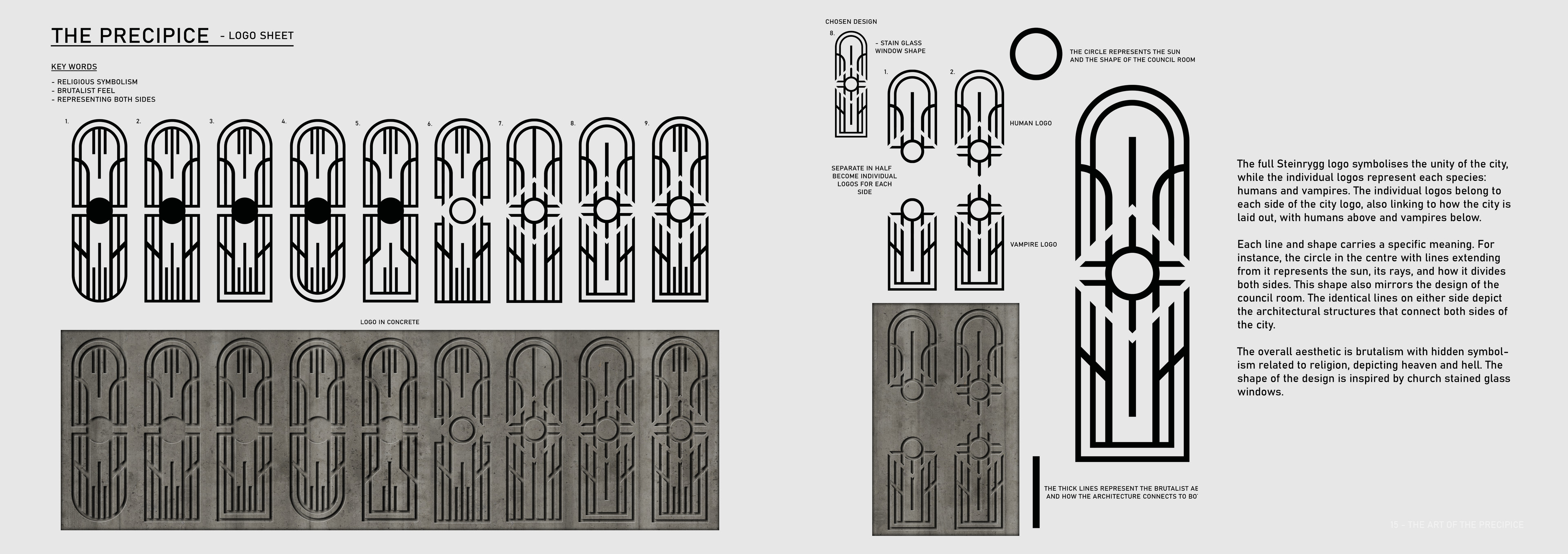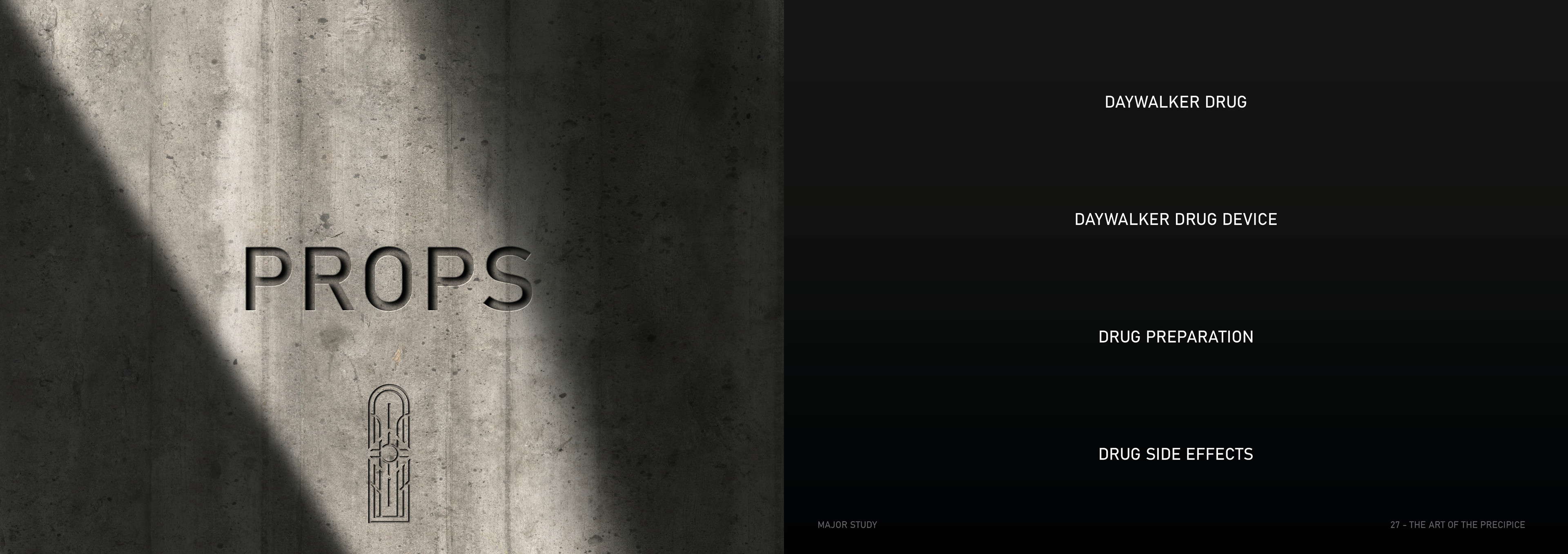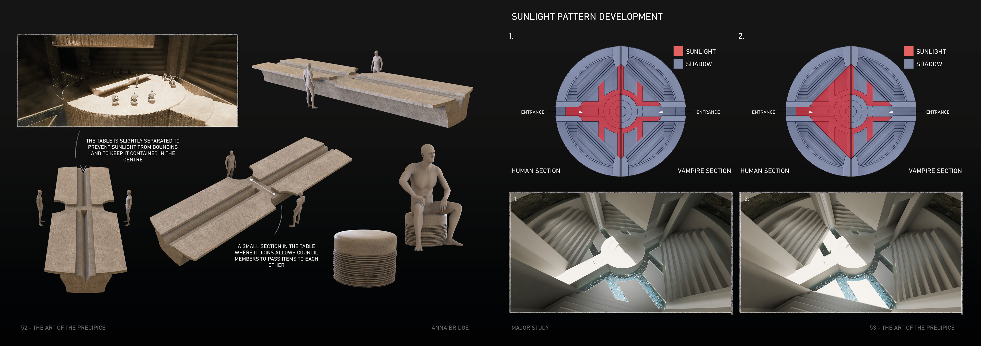 The Precipice is a science fiction TV series set in the Arctic Circle, where the sun never sets, at the edge of a dramatic mountain range. The city of Steinrygg is split into two factions: humans live in the daylight in the upper section of the city, while vampires occupy the valley below, protected from sunlight by a thick mountain fog. Dominating the city is the austere headquarters of the authoritarian government, connecting both the human and vampire realms. The severe concrete building runs from above the cliff’s edge through the centre of the mountain and down to the valley below, providing a central forum where vampires and humans can converge. For centuries, the two factions have coexisted under a strict alliance between the human and vampire governments.