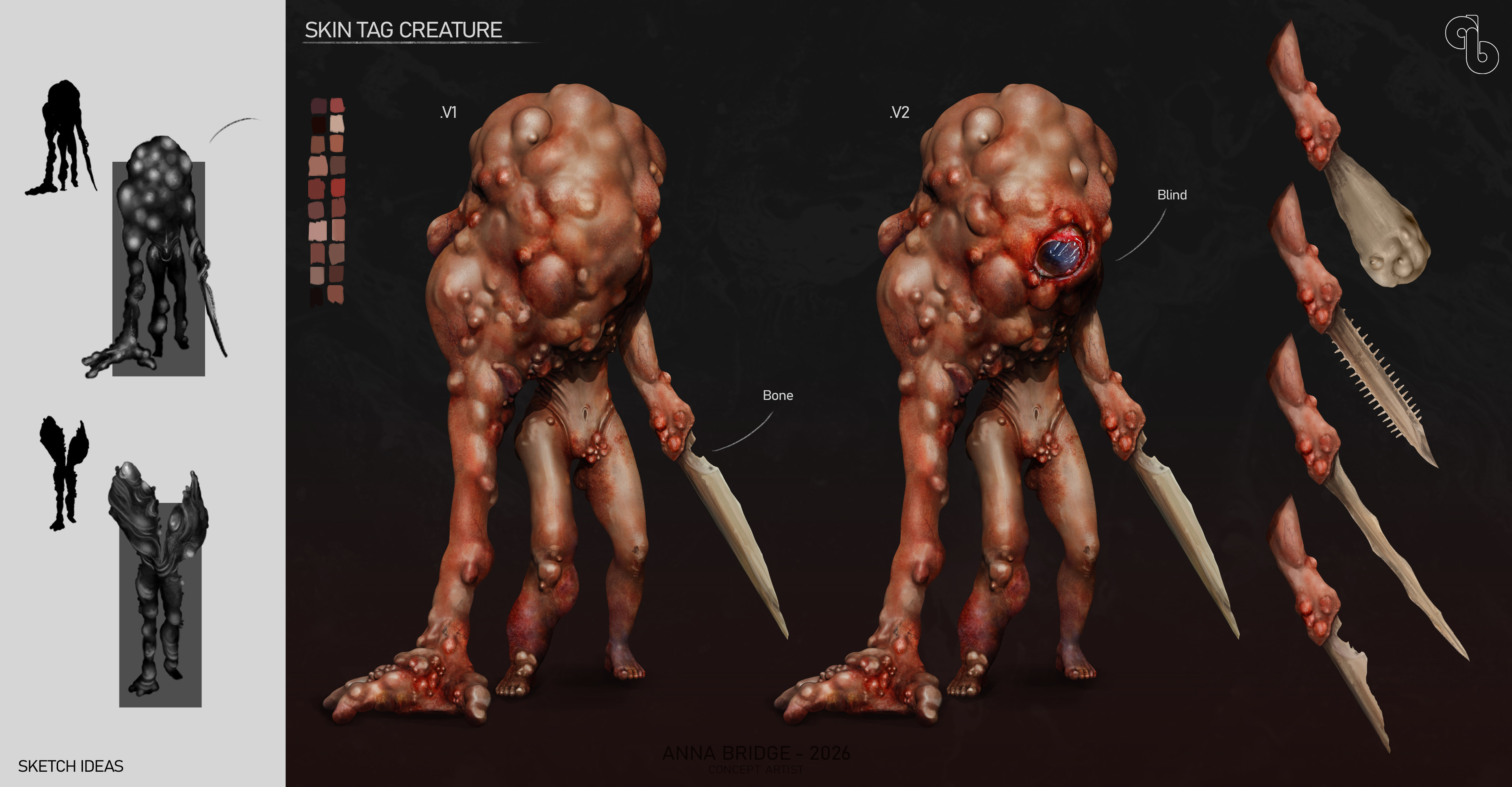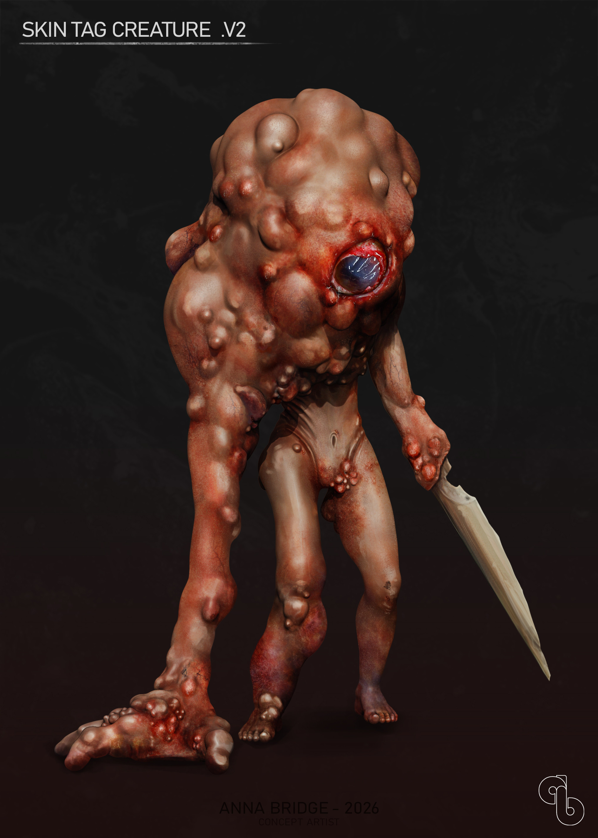The concept of the skin tag monster was a quick idea I needed to get down. I kept seeing these forms and shapes in my mind, and I wanted to sculpt them. This creature is deformed by large and small lumps; one arm is long, with a massive hand that has been affected by arthritis. The other arm has retained its human features but lost the hand, replaced by a bone blade.